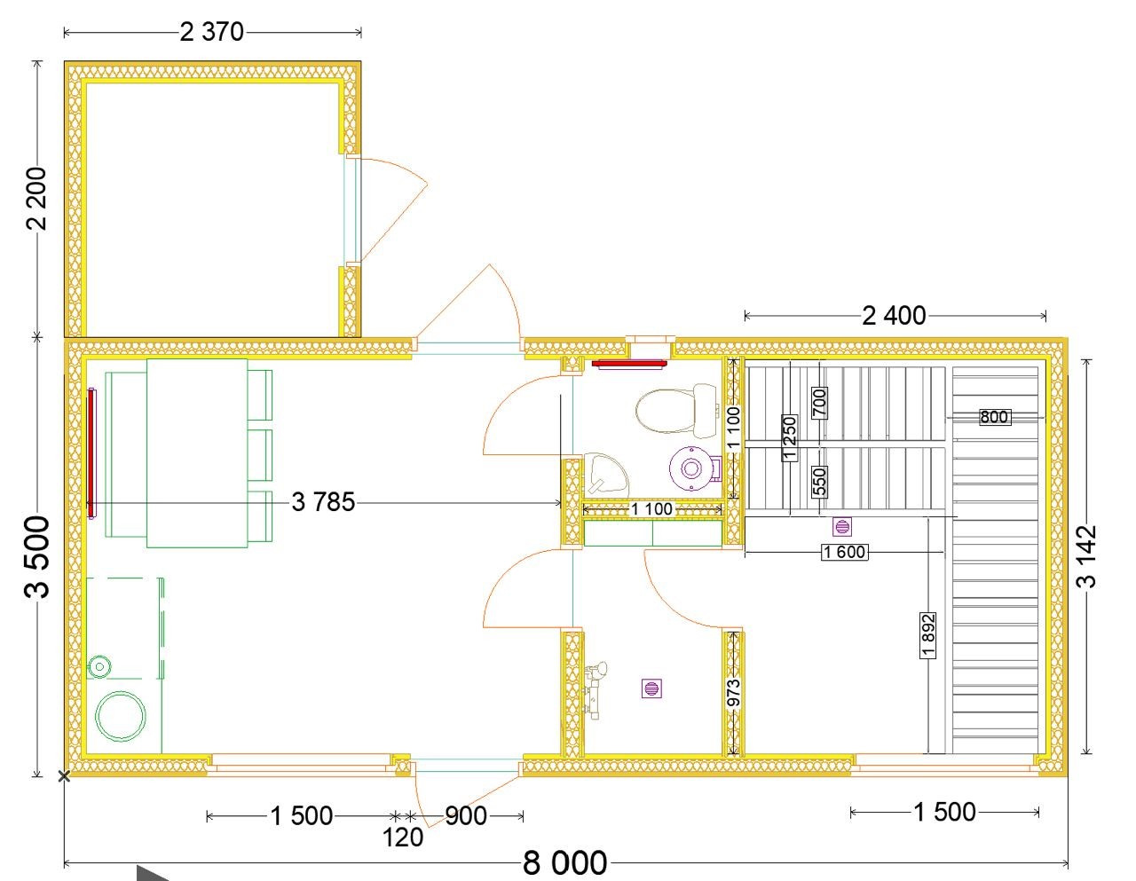 Загальний опис: Лазня 8000 х 3500 модульна, каркасно щитова , згідно ескізу. Полки в парній кімнаті вироблені з термо-сосни. Стіни в парній кімнаті оброблені термо-сосною. В парній все дерево в одному кольорі.